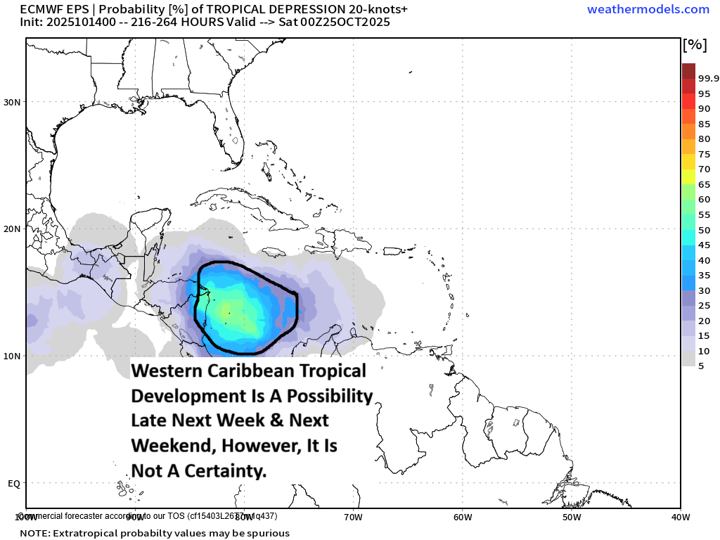 Another item of concern down the road is that the longer Melissa hangs around the western Caribbean, the bigger the impact it could have on the weather in the western North Atlantic & along parts of the East Coast of the United States. The reason for this is due to the fact that a rather strong upper level trough is expected to push through the Eastern United States near Halloween. It’s possible that Melissa could get entangled in this upper level trough leading to the potential for a significant storm near the Eastern Seaboard that brings heavy rain & strong winds around Halloween. It’s something to definitely watch.