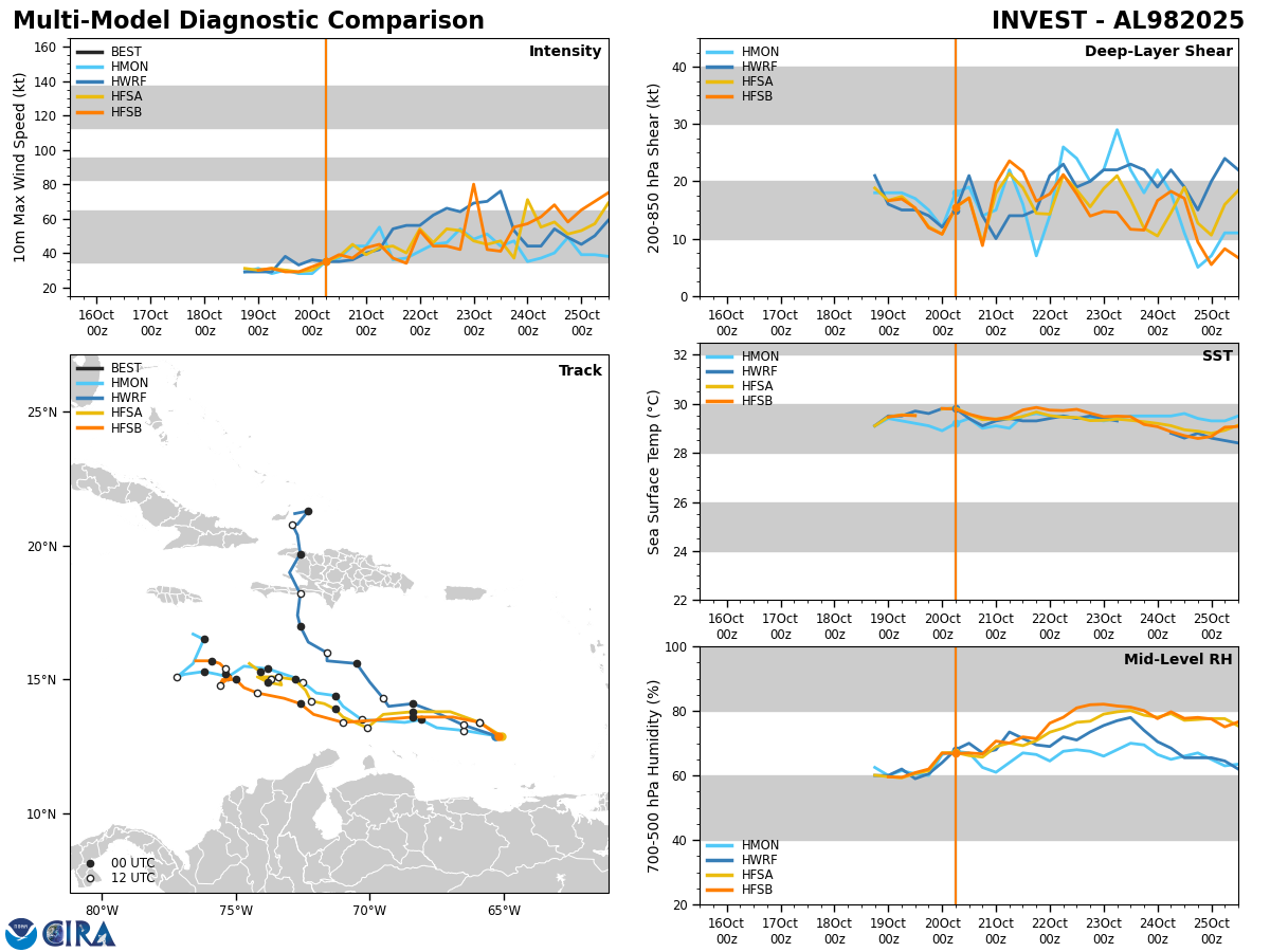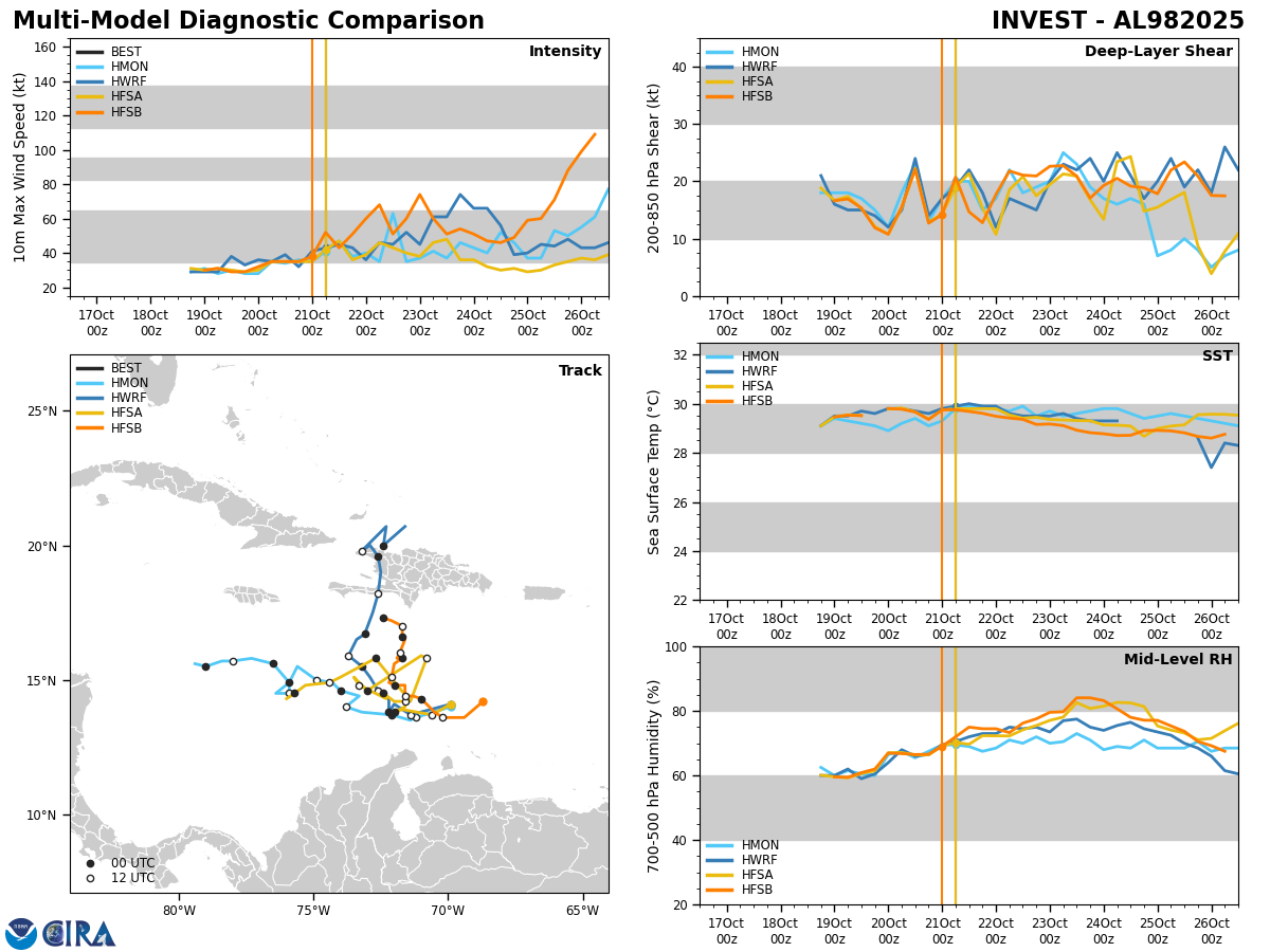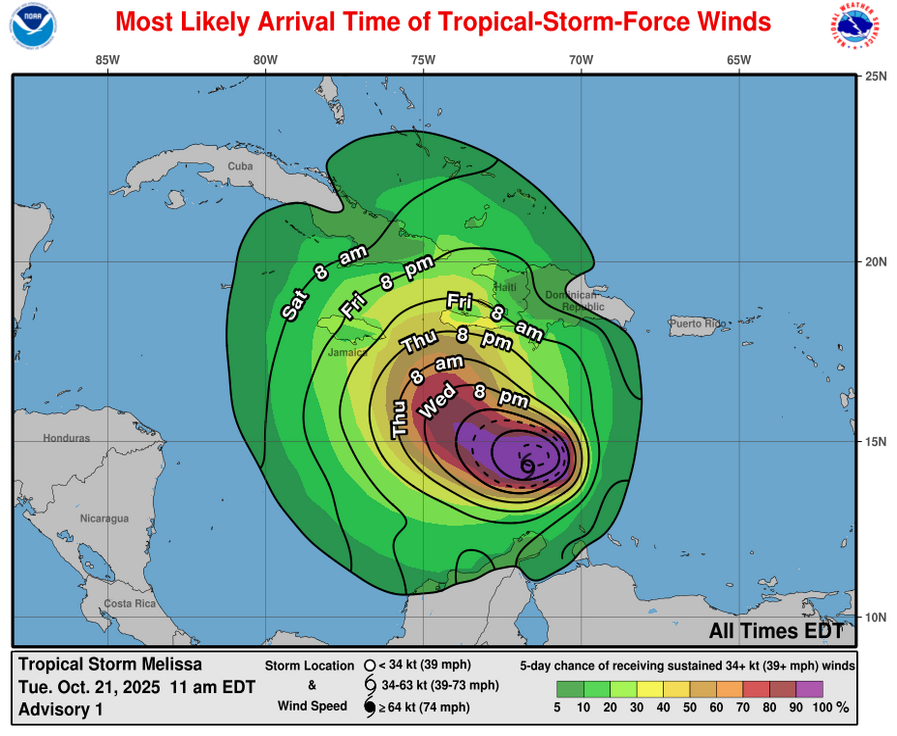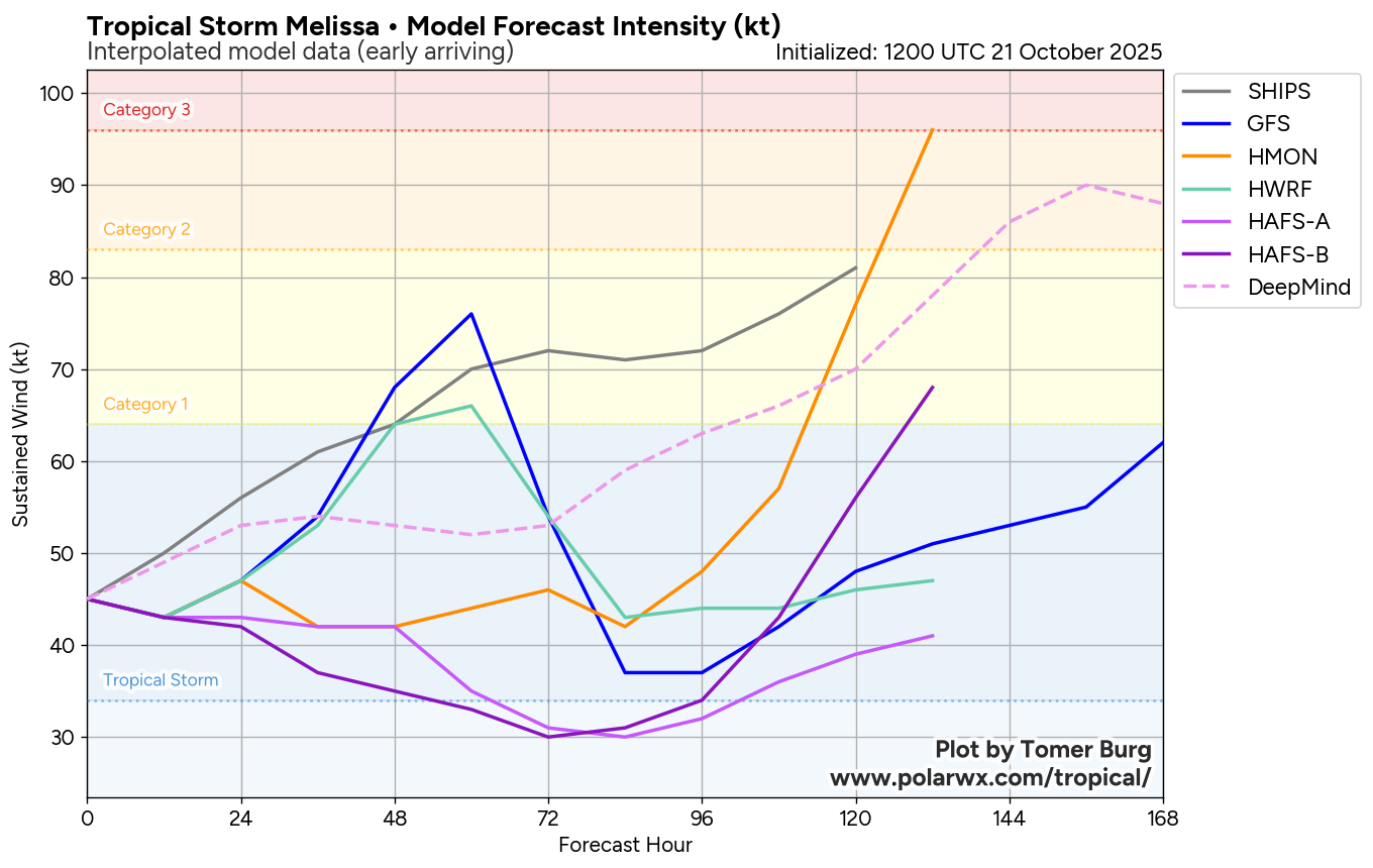 This means that there may be quite a bit in the way of impacts for the islands of the central and northwestern Caribbean from Melissa, both in terms of heavy rainfall & also in the way of winds, depending on the track. This includes Jamaica, Haiti, Cuba and the Cayman Islands. Eventually, the Bahamas may also be significantly impacted by Melissa towards the middle and later parts of next week.
