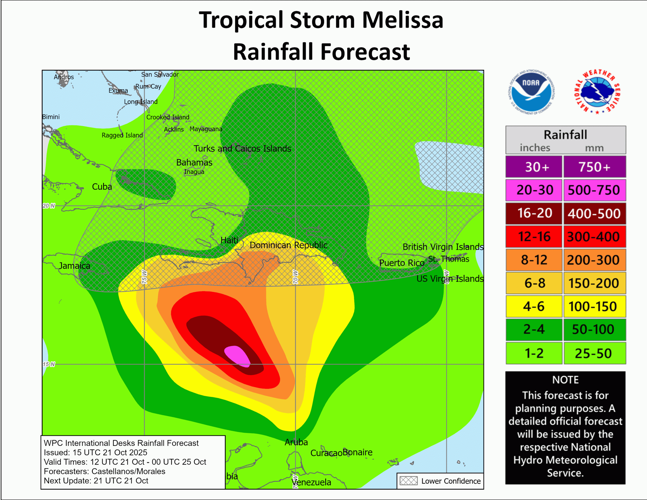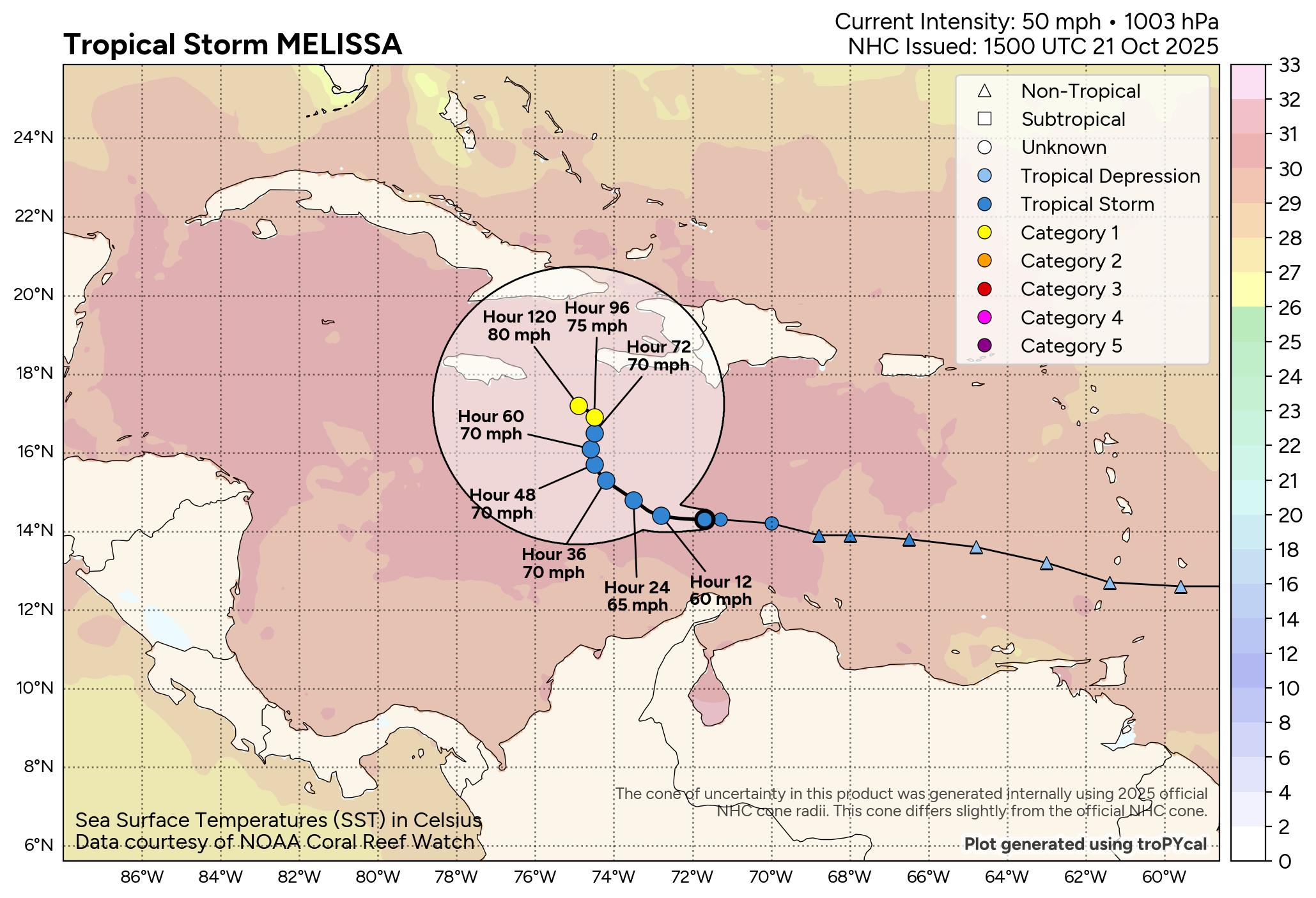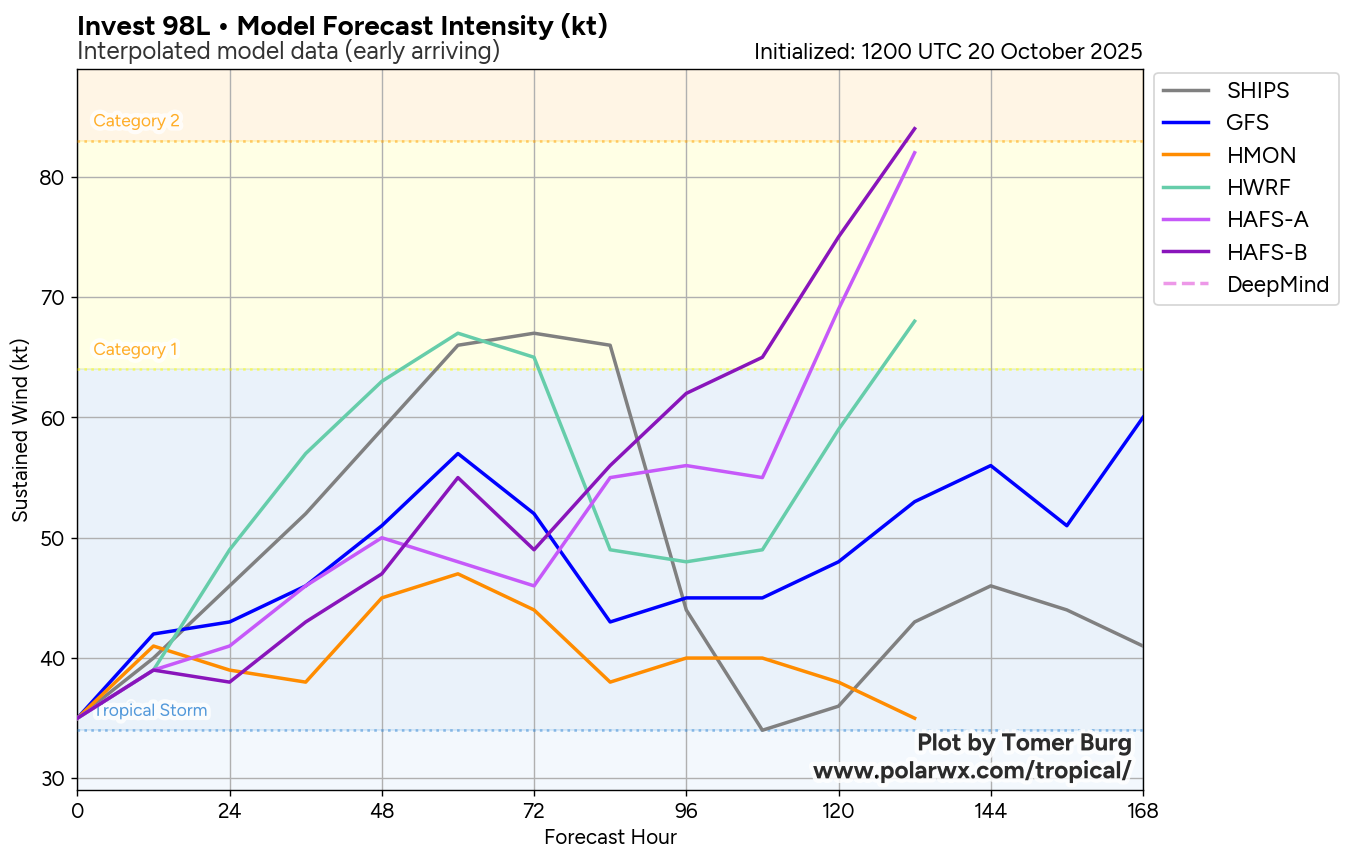 This means that there may be quite a bit in the way of impacts for the islands of the central and northwestern Caribbean from Melissa, both in terms of heavy rainfall & also in the way of winds, depending on the track. This includes Jamaica, Haiti, Cuba and the Cayman Islands. Eventually, the Bahamas may also be significantly impacted by Melissa towards the middle and later parts of next week.