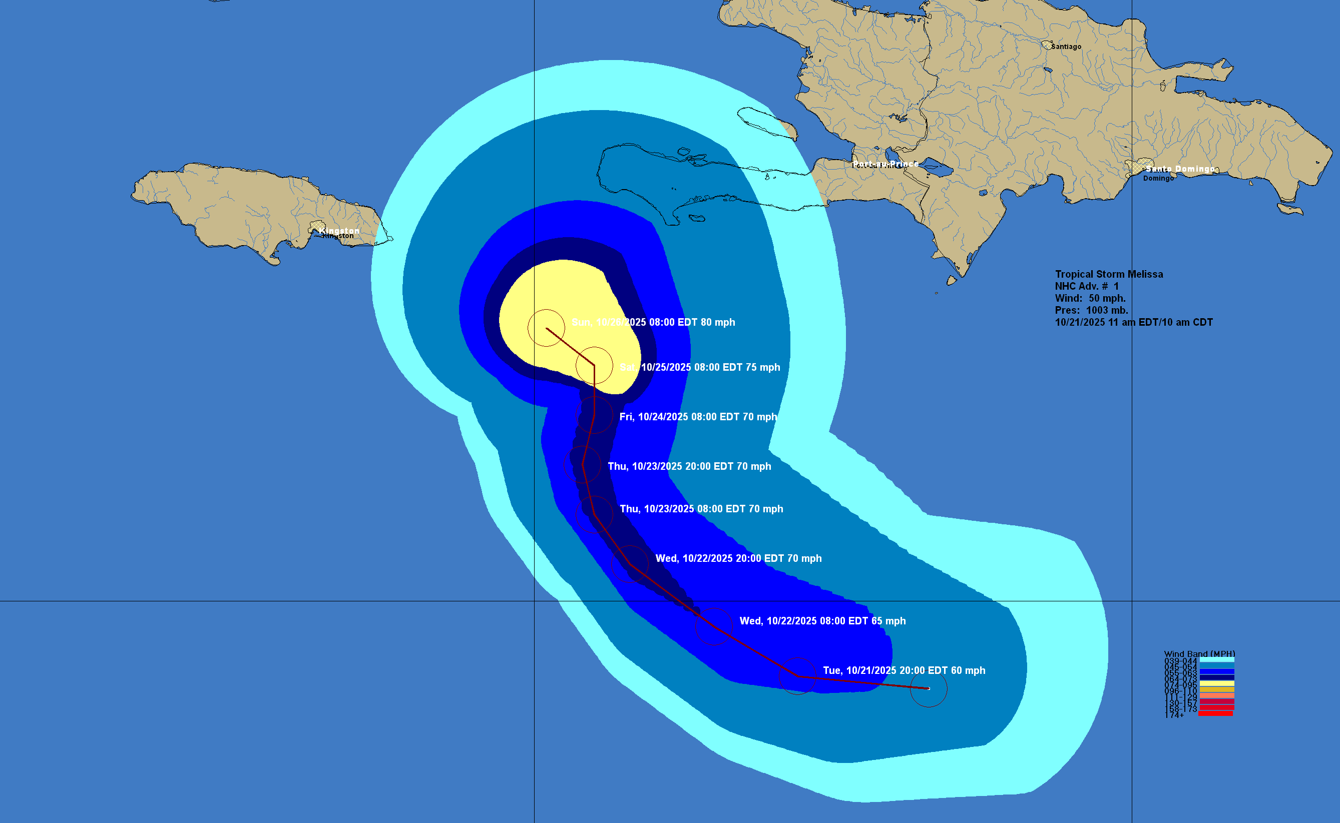 Melissa has an organized deep convection and a well-defined low-level center with 50 mph maximum winds and central barometric pressure of 1003 millibars. Currently, Melissa is headed on a westerly course at a fairly quick pace. It is likely that Melissa will slow way down in forward speed and should put the brakes on as it reaches the area to the southeast of Jamaica in the next day or two.