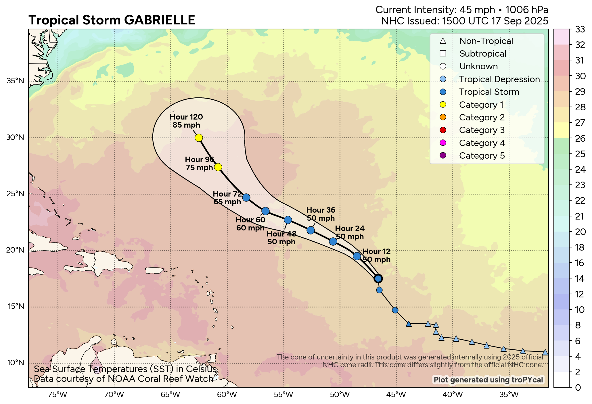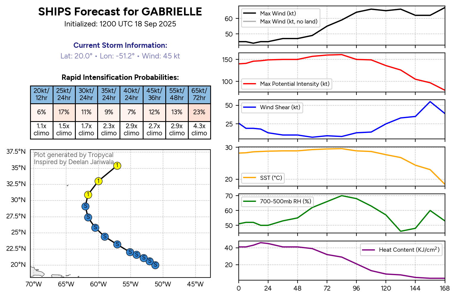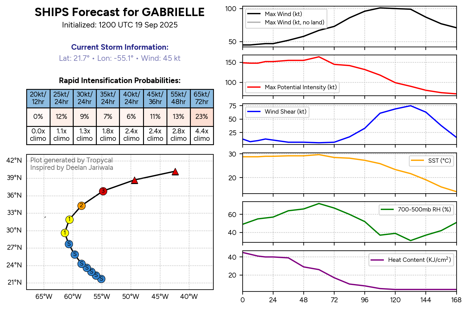 Tropical Storm Gabrielle: Gabrielle remains a sheared storm with most of the convection occurring to the east of its low-level center. That said, Gabrielle does look more organized than it did at this time yesterday.