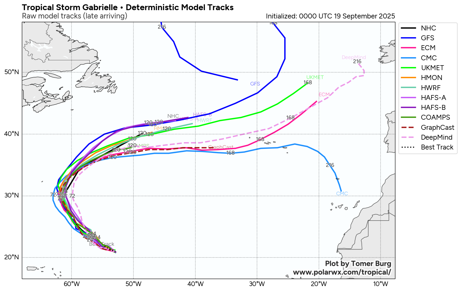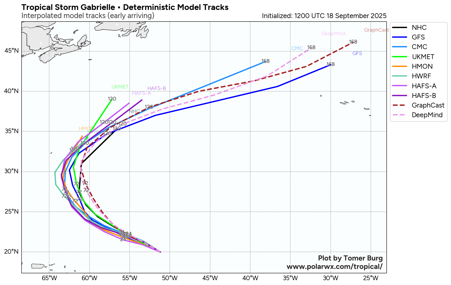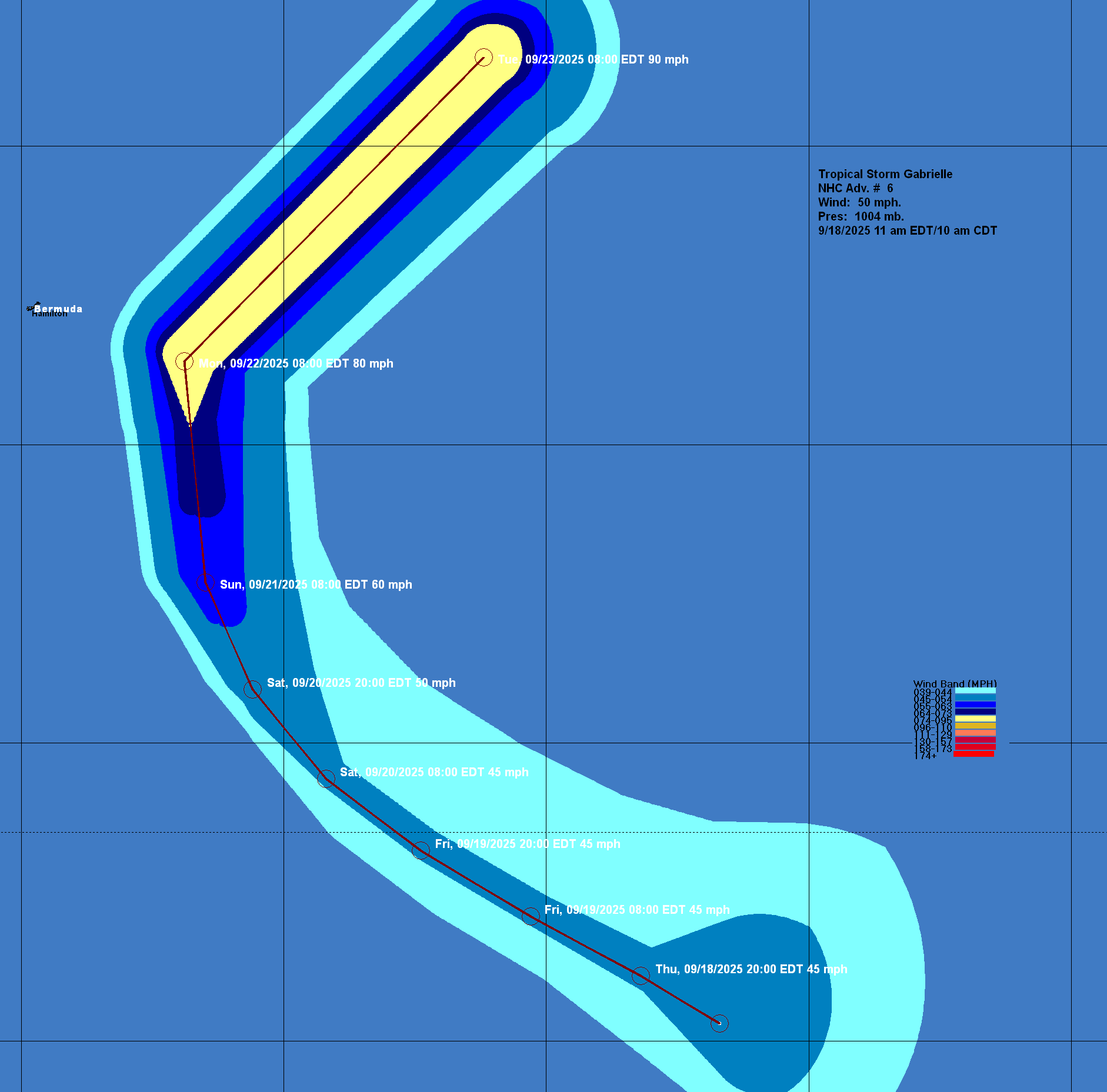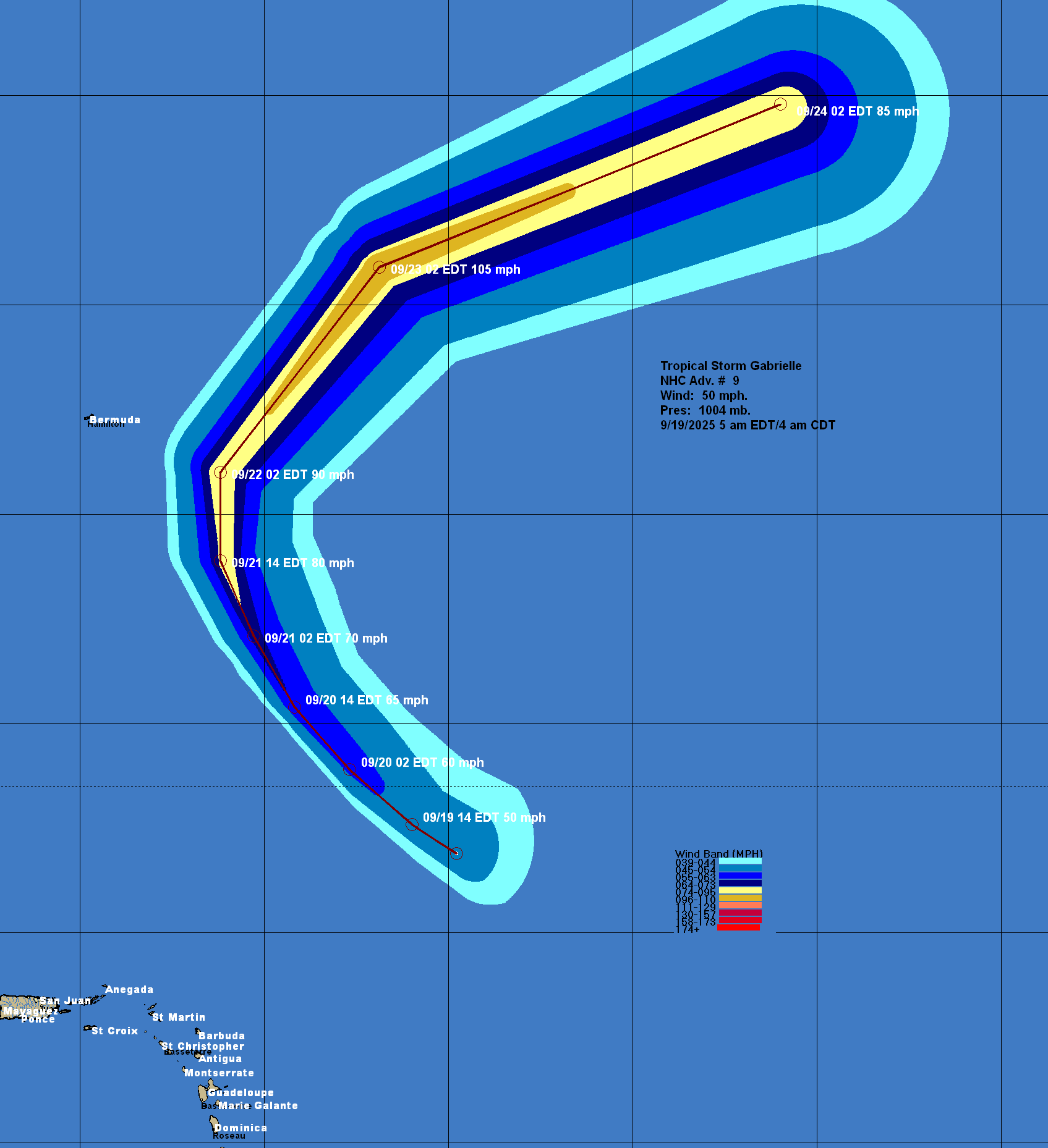Gabrielle is heading in a west-northwest to northwest direction today and it looks likely that it will move to the northwest throughout this weekend before it turns to the north and northeast by early next week. Additionally, the wind shear that has been affecting Gabrielle is expected to decrease during this weekend & this should allow the storm to strengthen to probably a hurricane sometime between Sunday and Monday. Gabrielle will then maintain its hurricane strength as it heads in a northeasterly direction next week.