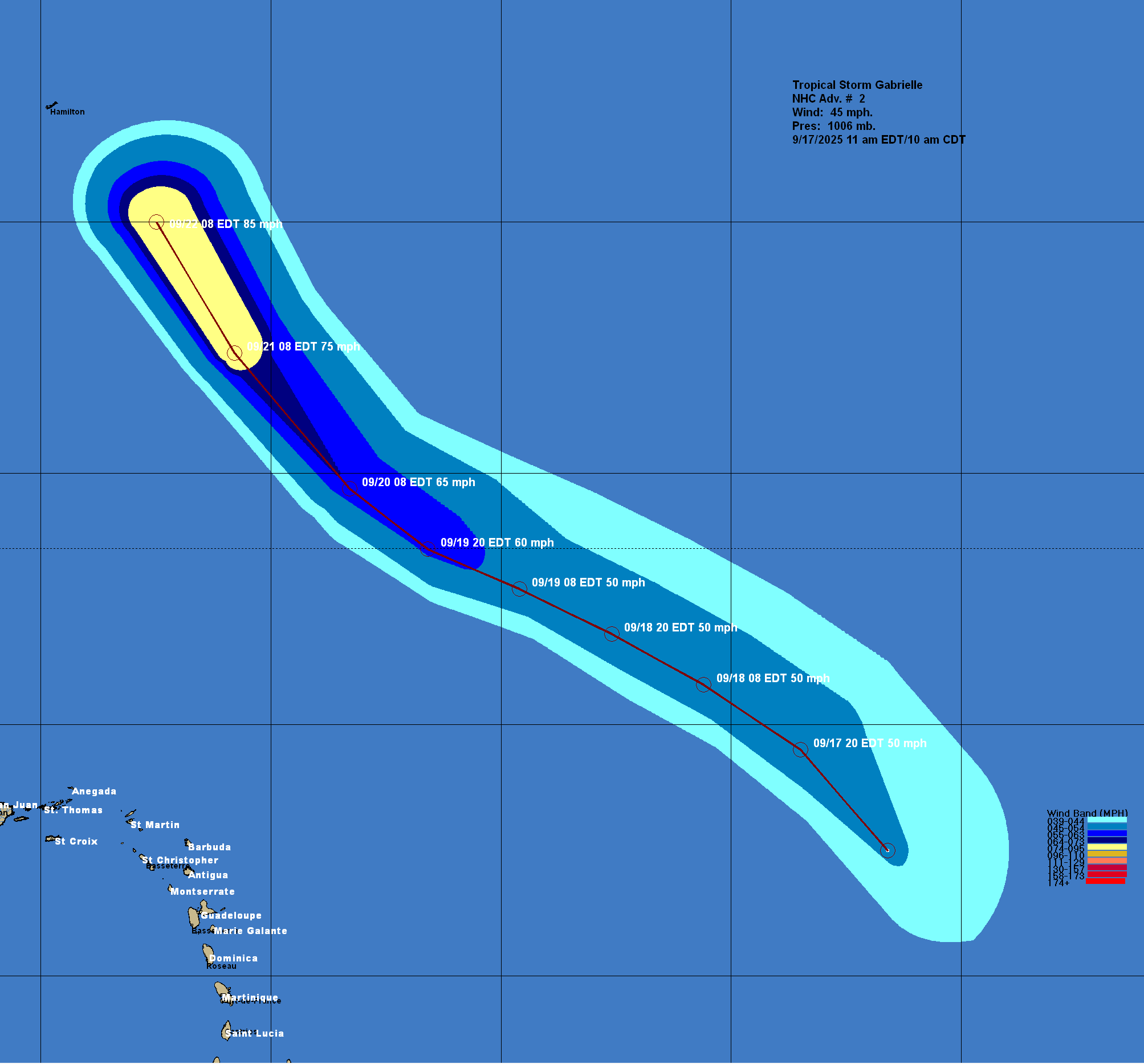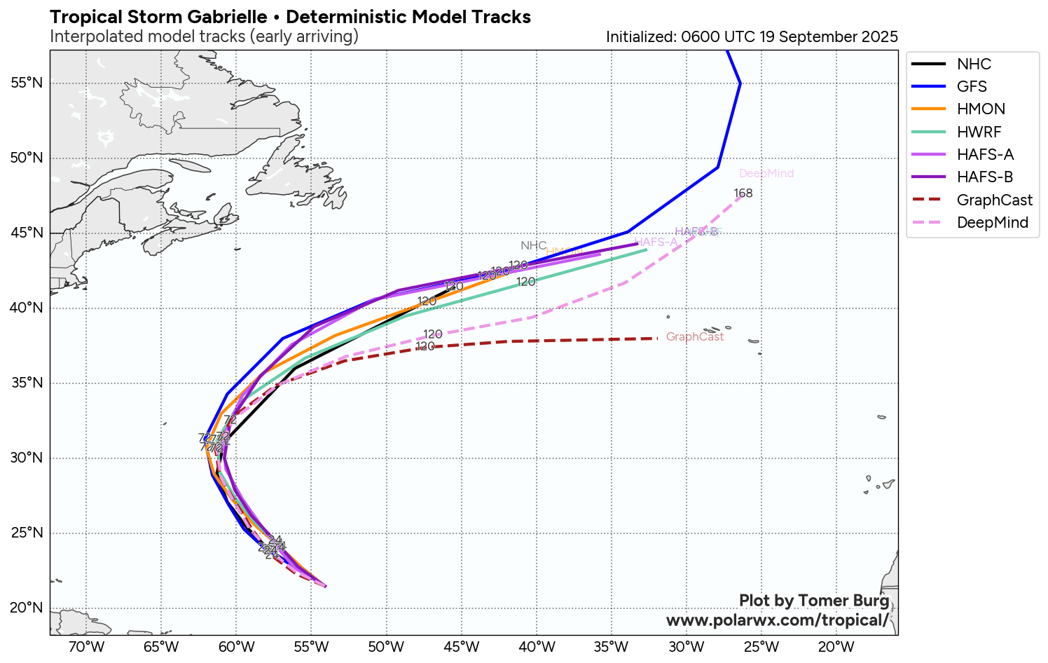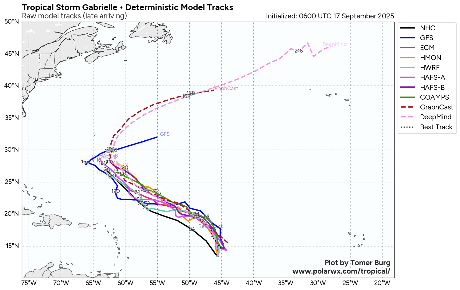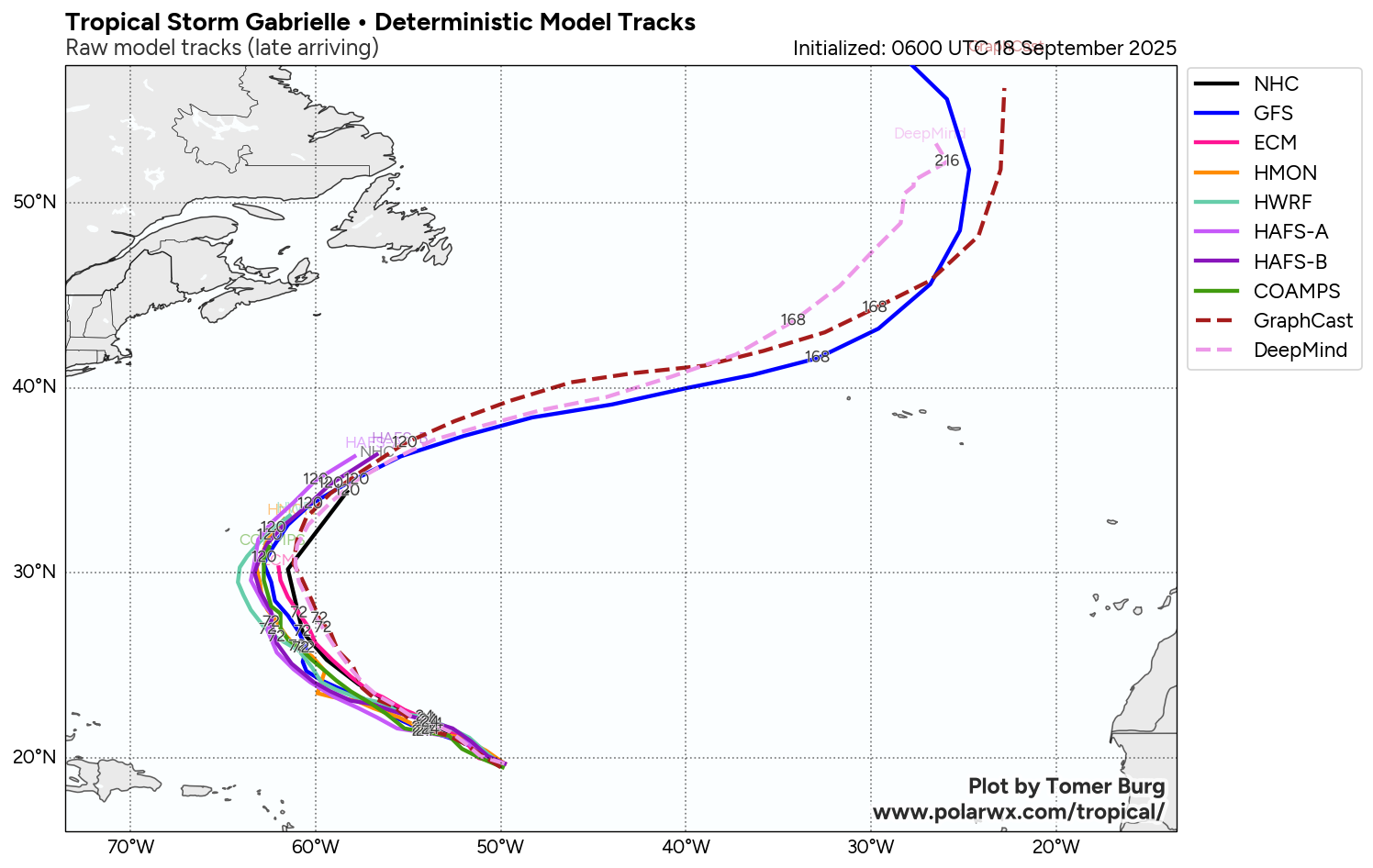 Gabrielle is heading in a west-northwest to northwest direction today and it looks likely that it will move to the northwest throughout this weekend before it turns to the north and northeast by early next week. Additionally, the wind shear that has been affecting Gabrielle is expected to decrease during this weekend & this should allow the storm to strengthen to probably a hurricane sometime between Sunday and Monday. Gabrielle will then maintain its hurricane strength as it heads in a northeasterly direction next week.