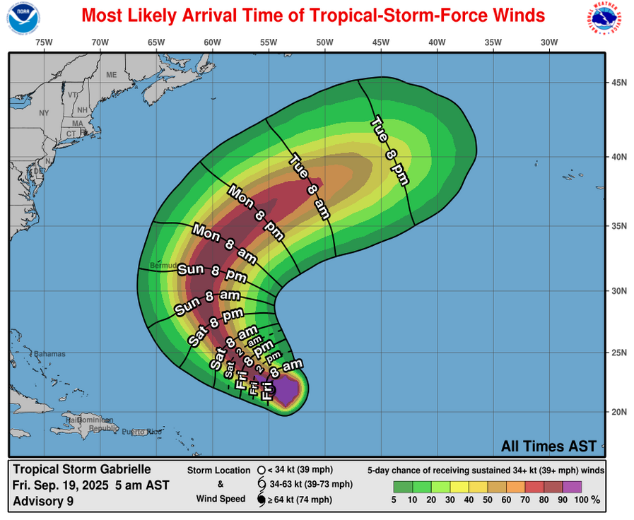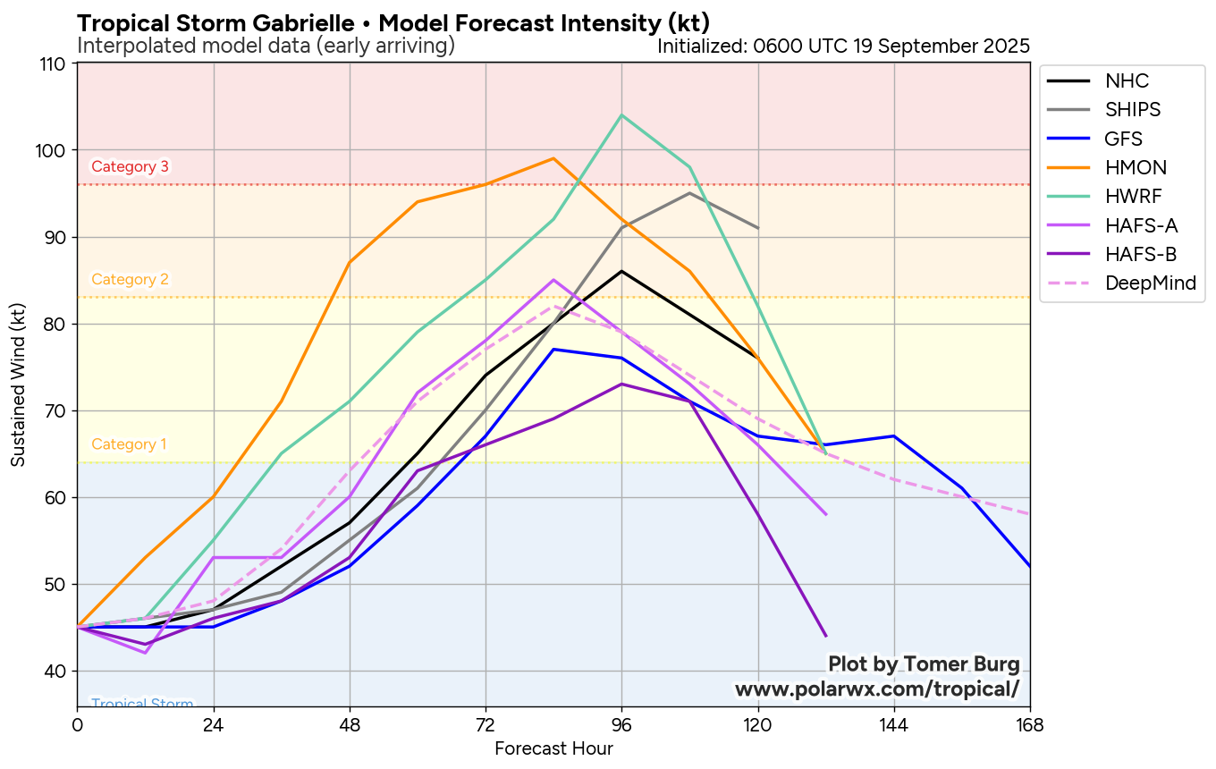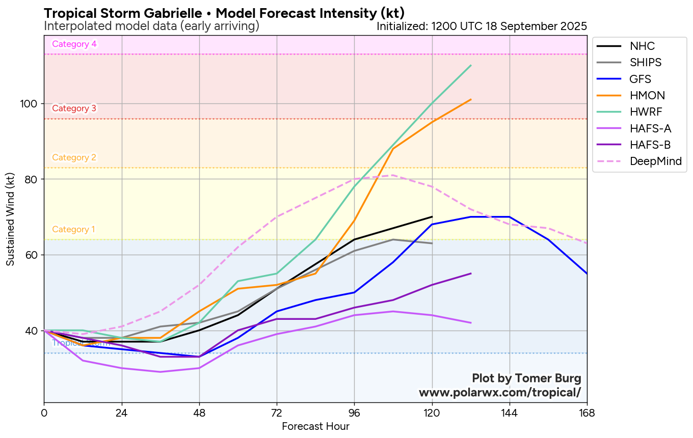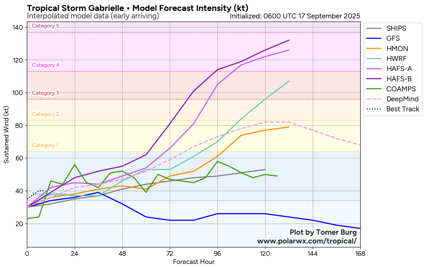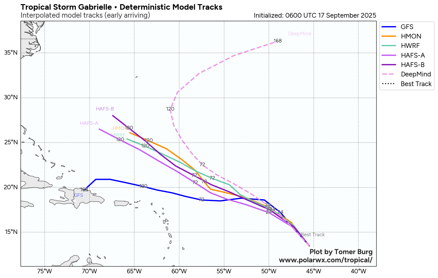 Gabrielle is heading in a west-northwest to northwest direction today and it looks likely that it will move to the northwest throughout this weekend before it turns to the north and northeast by early next week. Additionally, the wind shear that has been affecting Gabrielle is expected to decrease during this weekend & this should allow the storm to strengthen to probably a hurricane sometime between Sunday and Monday. Gabrielle will then maintain its hurricane strength as it heads in a northeasterly direction next week.
