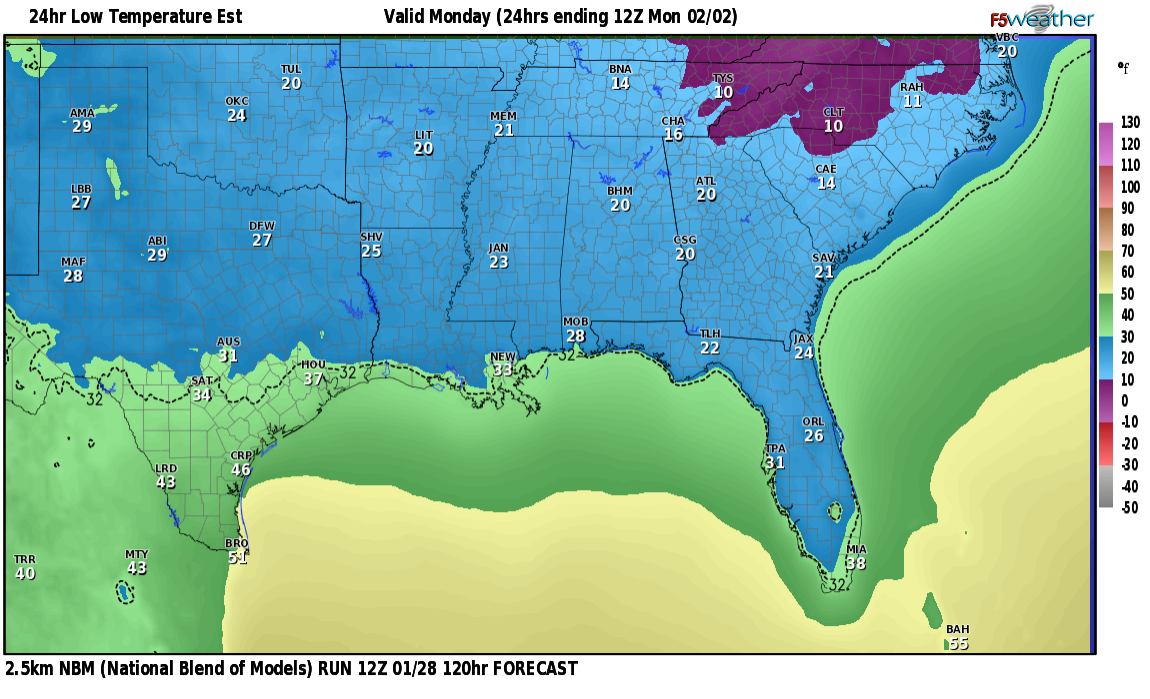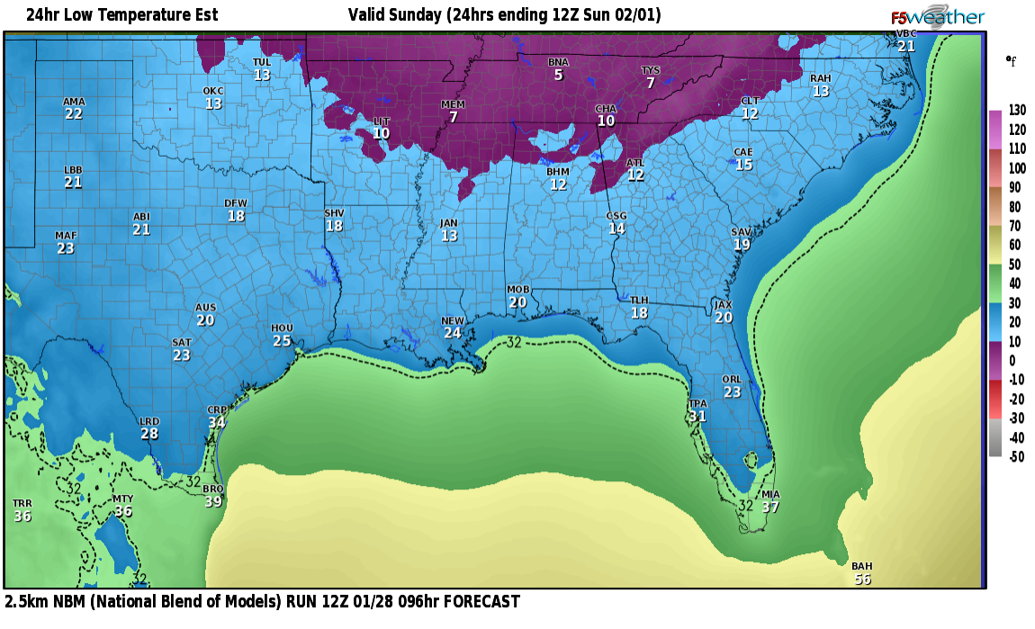 Low temperatures on both Sunday morning and Monday morning will range from the teens to low 20s across the Florida Panhandle to the low to mid 20s across all of north Florida and all of Central Florida, including the Orlando area and the I-4 corridor. Low temperatures across South Florida on Sunday morning and Monday morning will be in the low to middle 30s and this does include Miami. These temperatures would likely smash record low temperatures across the entire state on both Sunday morning and Monday.