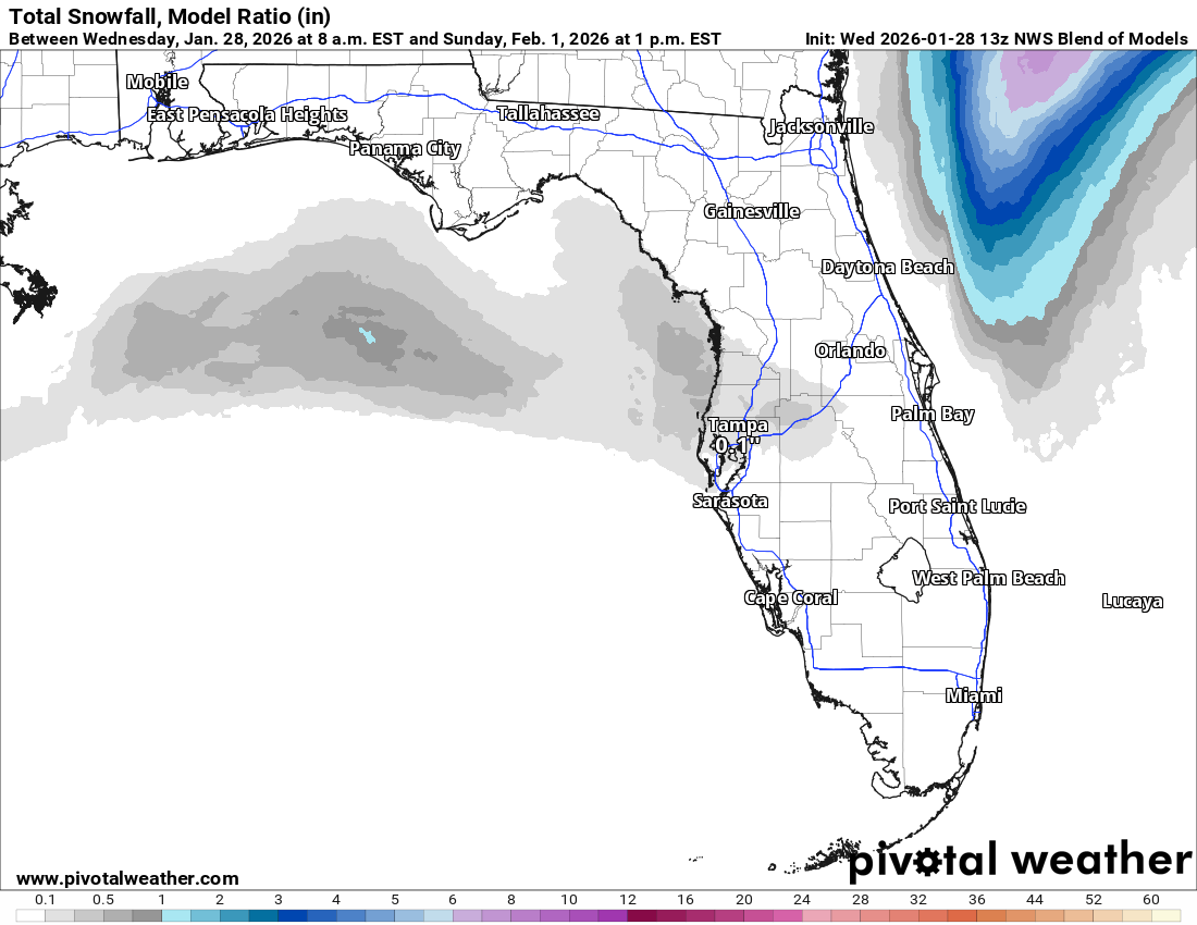 Finally, there continues to be the possibility of Gulf effect snow flurries and snow showers to occur late Saturday night into Sunday morning across the area along the I-4 corridor from Tampa to Orlando. A plume of low-level moisture may push eastward off of the Gulf during late Saturday night and Sunday morning leading to the possibility of snow flurries and snow showers that might actually deposit a light dusting of snow in some areas.